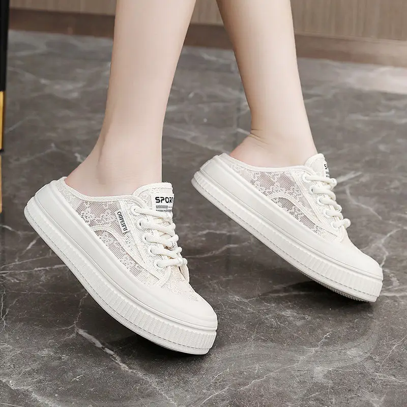 XFF69 Women's Spring/ Autumn Fashion Trend Half Slip-On Shoes Summer Mesh Breathable Round Head Lace-Up Anti-Slip